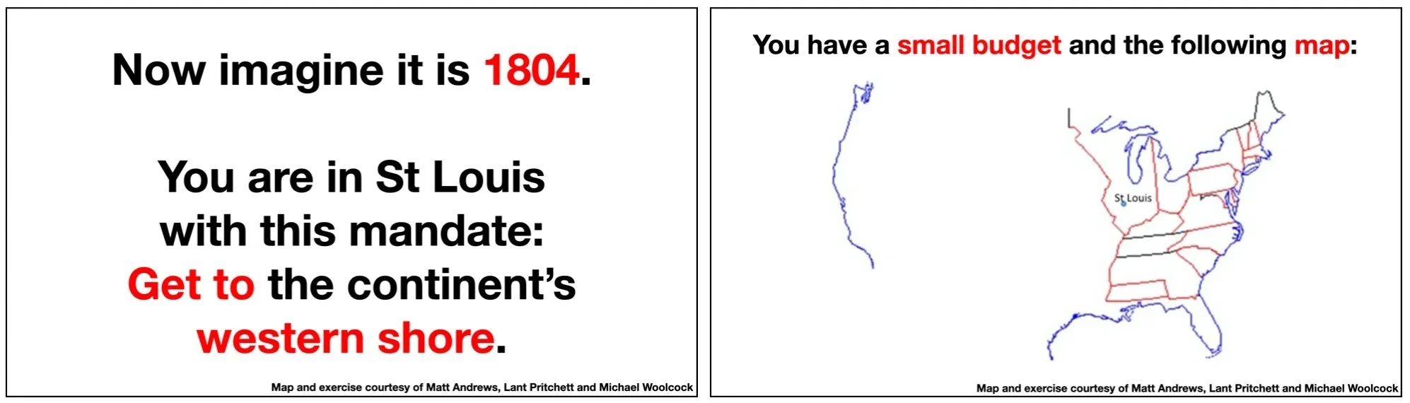 🙏 *The "Go West" exercise outlined below was developed by Matt Andrews at the Centre for International Development at the Harvard Kennedy School. More on the exercise can be found in Chapter 6 of Building State Capability: Evidence, Analysis, Action by Matt Andrews, Lant Pritchett and Michael Woolcock, Oxford University Press, 2017. ***We are grateful to him for letting us use and adapt it.